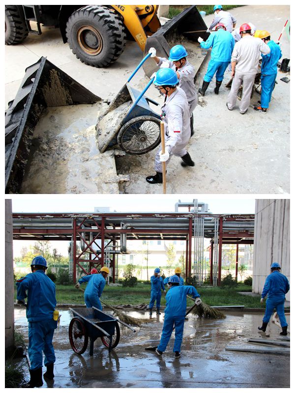 活動中,在黨支部書記的戰(zhàn)前動員和安排部署下,所有人員被分為兩組,對一級塔和二級塔進行清理。布管、沖洗、鏟除、裝車、倒料,雖然現(xiàn)場配有兩輛裝載機,但由于大型機械無法靠近脫硫塔人孔,清理工作還需配合人力斗車,一車一車轉(zhuǎn)運。時間緊、任務重,全體隊員簡單解決午飯后,自覺放棄休息時間,匆匆又回到勞動現(xiàn)場,投入到與時間賽跑的戰(zhàn)斗中。歷經(jīng)8小時左右的全力奮戰(zhàn),下午16時所有工作圓滿結(jié)束。