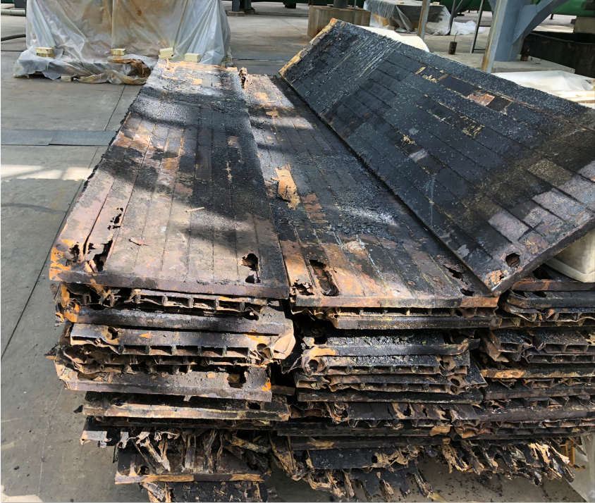 自陽極分公司焙燒車間電捕焦油器瀝青焦油清理完成并投入運(yùn)行以來,煙氣排放指標(biāo)穩(wěn)定,效果較為明顯。但由于近一段時(shí)間以來的高負(fù)荷運(yùn)行,以及設(shè)備長(zhǎng)期受瀝青焦油的侵蝕,部分極板出現(xiàn)損壞現(xiàn)象,捕集、吸附能力減弱,甚至引起電暈閉塞、系統(tǒng)電流降低等現(xiàn)象。