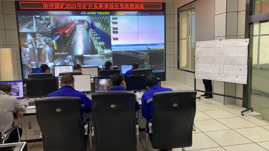 當(dāng)日9:00整,礦調(diào)度值班員接到井下1308運(yùn)順掘進(jìn)工作面跟班隊(duì)長(zhǎng)電話匯報(bào):“1308運(yùn)順掘進(jìn)工作面出現(xiàn)異響,巷道風(fēng)流紊亂,四聯(lián)巷風(fēng)門變形,巷道口有大量煙霧和粉塵出現(xiàn),正組織當(dāng)班人員按照避災(zāi)路線進(jìn)行撤離!彪S即,冶坪煤礦迅速啟動(dòng)事故應(yīng)急預(yù)案,演練正式開始。調(diào)度信息中心通知井下全體職工緊急有序升井,搶險(xiǎn)救援組、救援保障組、技術(shù)專家組和對(duì)外聯(lián)絡(luò)組立即投入到搶險(xiǎn)救援工作中。應(yīng)急救援指揮部成員相互溝通協(xié)調(diào),及時(shí)采取有效措施,有條不紊地進(jìn)行每一道演練程序,迅速地完成著每一道救災(zāi)任務(wù)。演練歷時(shí)1小時(shí)35分鐘圓滿結(jié)束。