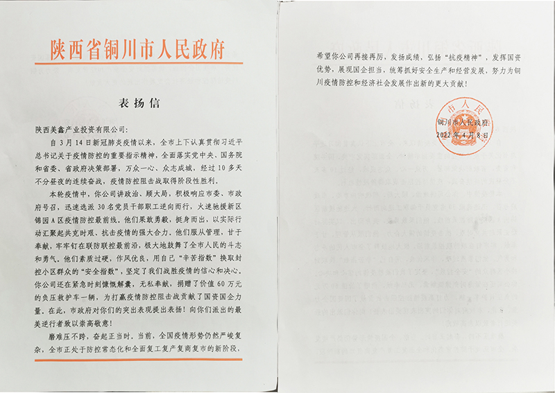 4月上旬,銅川市人民政府向我公司發(fā)來一封《表揚(yáng)信》,對(duì)公司積極參與銅川市3.14疫情防控工作付出的努力和做出的貢獻(xiàn)表示高度的贊揚(yáng),對(duì)公司主動(dòng)擔(dān)當(dāng)、勇于作為,防疫情、穩(wěn)生產(chǎn)取得的成績給予充分肯定。 3月21日,公司慷慨解囊,一致通過向銅川市紅十字會(huì)捐贈(zèng)總價(jià)值60萬元的負(fù)壓救護(hù)車、向銅川市人民醫(yī)院捐贈(zèng)10萬元抗疫資金的兩個(gè)重要決定,促使本地更加及時(shí)有效的開展基層醫(yī)療服務(wù)以及突發(fā)性公共衛(wèi)生事件的醫(yī)療救援,讓群眾享受更為專業(yè)、快捷的醫(yī)療服務(wù),提升銅川市抗擊疫情的基礎(chǔ)性保障。 |