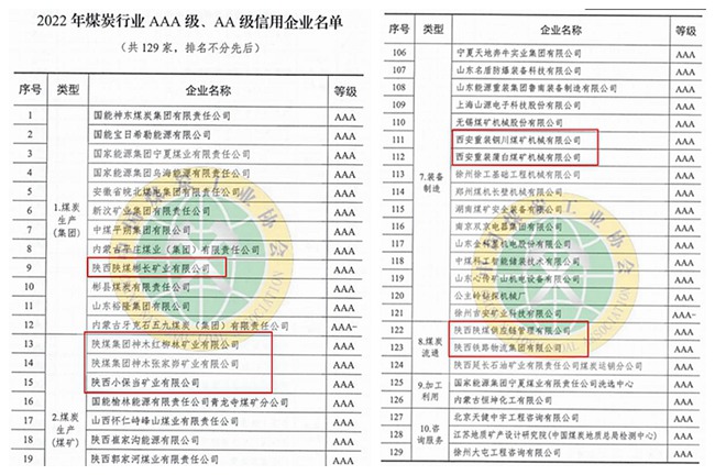 日前,中國煤炭工業(yè)協(xié)會下發(fā)了《關(guān)于公布2022年煤炭行業(yè)AAA級、AA級信用企業(yè)的通知》,陜煤集團(tuán)所屬的彬長礦業(yè)公司、紅柳林礦業(yè)公司、張家峁礦業(yè)公司、小保當(dāng)?shù)V業(yè)公司、西安重裝銅川煤機(jī)公司、西安重裝蒲白煤機(jī)公司、陜煤供應(yīng)鏈公司、鐵路物流集團(tuán)公司等8家單位榮獲“2022年煤炭行業(yè)AAA級信用企業(yè)”稱號。 近年來,陜煤集團(tuán)及所屬單位堅持誠信為本的經(jīng)營理念,在引領(lǐng)行業(yè)誠信經(jīng)營方面作出了突出貢獻(xiàn),樹立了良好形象,贏得了社會各界與客戶的普遍信賴與贊譽(yù)。 據(jù)了解,企業(yè)信用等級評價考核企業(yè)經(jīng)營管理、誠信建設(shè)、財務(wù)實力、信用記錄、發(fā)展能力等數(shù)十項指標(biāo),全面綜合評價企業(yè)誠信建設(shè)和信用管理水平,提高了企業(yè)的整體公信度,在全國范圍內(nèi)影響頗深。此次煤炭企業(yè)信用等級評價工作是中國煤炭工業(yè)協(xié)會推進(jìn)煤炭行業(yè)信用體系建設(shè),進(jìn)一步弘揚(yáng)“誠信文化”、凝聚“榜樣力量”、共建“信用煤炭”,加快提升煤炭企業(yè)信用管理水平的具體舉措。此次經(jīng)過企業(yè)申報、現(xiàn)場評審、專家評議、社會公示等程序,共有129家企業(yè)榮獲煤炭行業(yè)AAA級、AA級信用企業(yè)稱號。 |