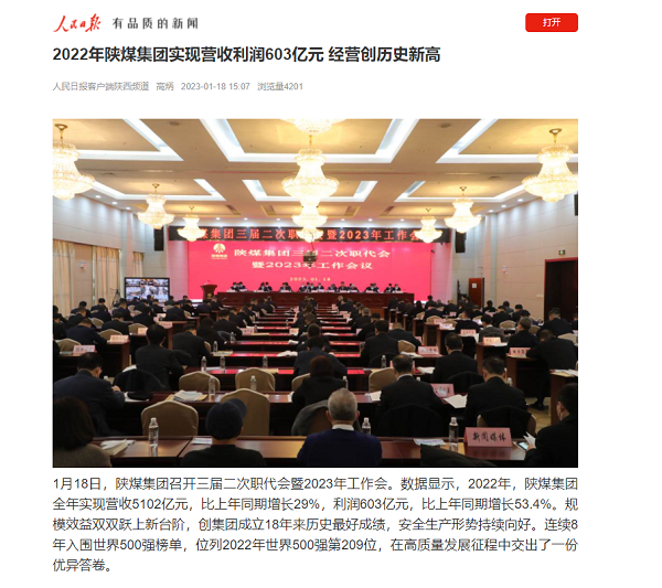 1月18日,陜煤集團(tuán)公布數(shù)據(jù)顯示,2022年,陜煤集團(tuán)全年實(shí)現(xiàn)營(yíng)收5102億元,比上年同期增長(zhǎng)29%,利潤(rùn)603億元,比上年同期增長(zhǎng)53.4%,創(chuàng)集團(tuán)成立18年來歷史最好成績(jī)。 2022年,陜煤集團(tuán)各實(shí)體產(chǎn)業(yè)板塊緊扣供需實(shí)際,積極實(shí)施相機(jī)調(diào)控,有效實(shí)現(xiàn)了提質(zhì)、穩(wěn)量、增效目標(biāo)。其中,完成煤炭產(chǎn)銷量2.3億噸,各類化工產(chǎn)品產(chǎn)量接近2000萬(wàn)噸,發(fā)電量突破500億度,粗鋼產(chǎn)量保持在1200萬(wàn)噸水平,其他實(shí)物量指標(biāo)穩(wěn)中有進(jìn)。 同時(shí),集團(tuán)全面發(fā)力“雙智”建設(shè),在行業(yè)率先開展數(shù)據(jù)標(biāo)準(zhǔn)化治理和智能專網(wǎng)建設(shè),上線運(yùn)行智能礦井地質(zhì)保障等8大智能信息系統(tǒng),并入選工信部“2022特色工業(yè)互聯(lián)網(wǎng)50佳”榜單。7處全國(guó)首批智能化示范煤礦通過國(guó)家驗(yàn)收,彬長(zhǎng)、黃陵等5個(gè)智慧礦區(qū)先后建成,建成智能礦井28處,研發(fā)應(yīng)用智能快掘系統(tǒng)76套、智能機(jī)器人198個(gè),智能化產(chǎn)能占比達(dá)99%。“智能掘進(jìn)機(jī)器人系統(tǒng)”獲國(guó)家首臺(tái)套重大技術(shù)裝備認(rèn)定,全國(guó)首臺(tái)套450米超長(zhǎng)智能采煤工作面投入運(yùn)行,10米超大采高智能化采煤機(jī)進(jìn)入制造階段。 集團(tuán)還積極推進(jìn)綠色轉(zhuǎn)型,在重點(diǎn)行業(yè)企業(yè)大力開展環(huán)保設(shè)施運(yùn)行能效大會(huì)診,全年投入資金18.3億元,實(shí)施94項(xiàng)設(shè)施提標(biāo)改造工程,鋼鐵、水泥、電力等板塊企業(yè)已實(shí)現(xiàn)大氣主要污染物超低排放。全面建成煤礦地質(zhì)環(huán)境監(jiān)測(cè)系統(tǒng),部署監(jiān)測(cè)設(shè)備1500余套,實(shí)現(xiàn)遙感監(jiān)測(cè)覆蓋2059平方公里,實(shí)現(xiàn)重點(diǎn)部位環(huán)保監(jiān)測(cè)全天候覆蓋。 在技融雙驅(qū)疊加成長(zhǎng)方面,德國(guó)、日本技術(shù)研究院相繼落地,六大研究院、七大產(chǎn)業(yè)示范基地與秦創(chuàng)原30億元基礎(chǔ)研究創(chuàng)新基金,聯(lián)合搭建的“7個(gè)國(guó)家級(jí)+50個(gè)省級(jí)”科研平臺(tái),正在發(fā)生耦合與聚變。目前已累計(jì)組建科技經(jīng)紀(jì)人團(tuán)隊(duì)81個(gè),組建引進(jìn)6支“科學(xué)家+工程師”隊(duì)伍,積極推進(jìn)249項(xiàng)基礎(chǔ)研究項(xiàng)目和10個(gè)工業(yè)化示范項(xiàng)目,全力打造原創(chuàng)技術(shù)“策源地”。 2023年,陜煤集團(tuán)將繼續(xù)踐行安全生產(chǎn)、經(jīng)濟(jì)增長(zhǎng)、能源穩(wěn)價(jià)保供等責(zé)任和使命,努力完成營(yíng)收5500億元和利潤(rùn)500億元的工作目標(biāo),全力推動(dòng)陜煤集團(tuán)創(chuàng)建世界一流企業(yè)再上新臺(tái)階。 |