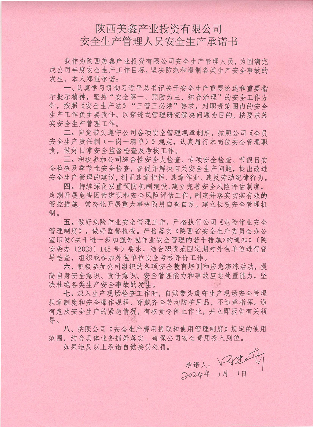 陜西美鑫產(chǎn)業(yè)投資有限公司安全生產(chǎn)承諾