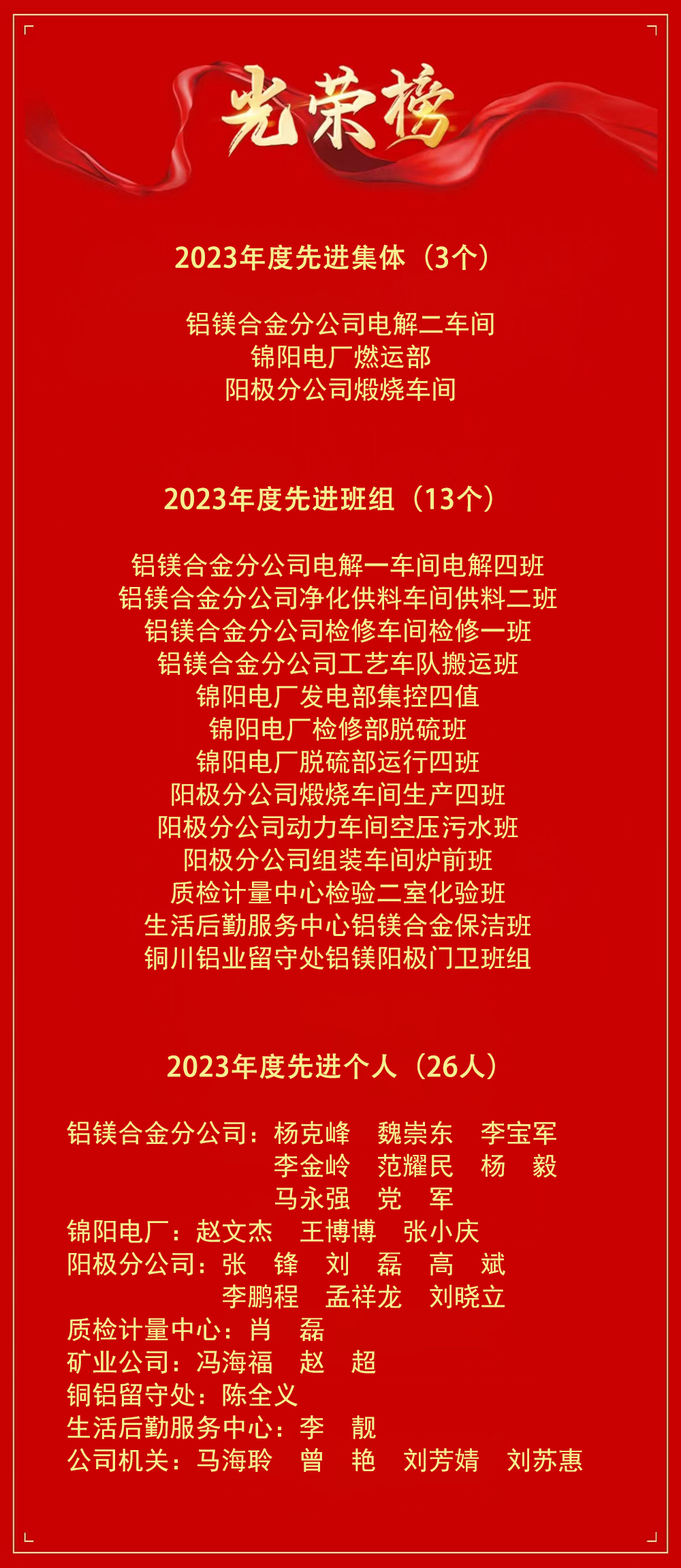 2023年,在集團公司的正確領導下,公司上下以習近平新時代中國特色社會主義思想為指引,全面貫徹落實黨的二十大精神,在廣大干部職工的共同努力下,安全生產(chǎn)、經(jīng)營工作、精益管理等各項工作取得了顯著成績,涌現(xiàn)出一批先進集體和先進個人。 為表彰先進,樹立典型,進一步激發(fā)廣大職工的工作積極性和熱情,經(jīng)基層單位推薦申報,公司先進評選委員會審核,公司黨委研究決定:授予鋁鎂合金分公司電解二車間等 3 個單位“先進集體”榮譽稱號;授予錦陽電廠發(fā)電部集控四值等 13 個班組“先進班組”榮譽稱號;授予楊克峰等 26 名同志“先進個人”榮譽稱號。 希望各單位和全體干部職工向受表彰的先進集體和先進個人學習,以他們?yōu)榘駱樱瑘F結(jié)協(xié)作、開拓進取、扎實工作、全力以赴,為公司高質(zhì)量發(fā)展做出新的更大的貢獻! |